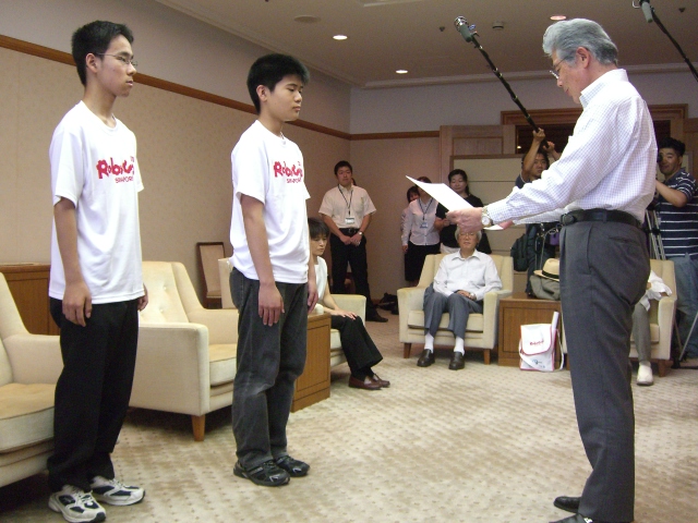 本校を、この3月に卒業した「科学技術工作部」の生徒チームが、在校中に行われた予選から勝ち上がった結果、卒業後の5月に大阪工業大学で行われた全国大会でみごと優勝し、世界大会(今年はシンガポール)に出場することになったからです。